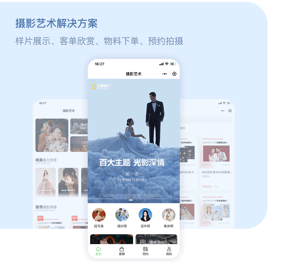 在功能方面,小火科技的摄影小程序涵盖了拍摄、预约、打印等多个环节。用户可以通过小程序在线预约拍摄时间,避免了传统电话预约的繁琐。同时,小程序还提供了多种拍摄套餐供用户选择,包括轻写真、婚纱照、证件照、集体照等,满足了不同用户的需求。此外,小程序还提供了照片云打印功能,用户可以将拍摄好的照片上传至云端,然后通过小程序进行在线打印,既方便又节省了时间。