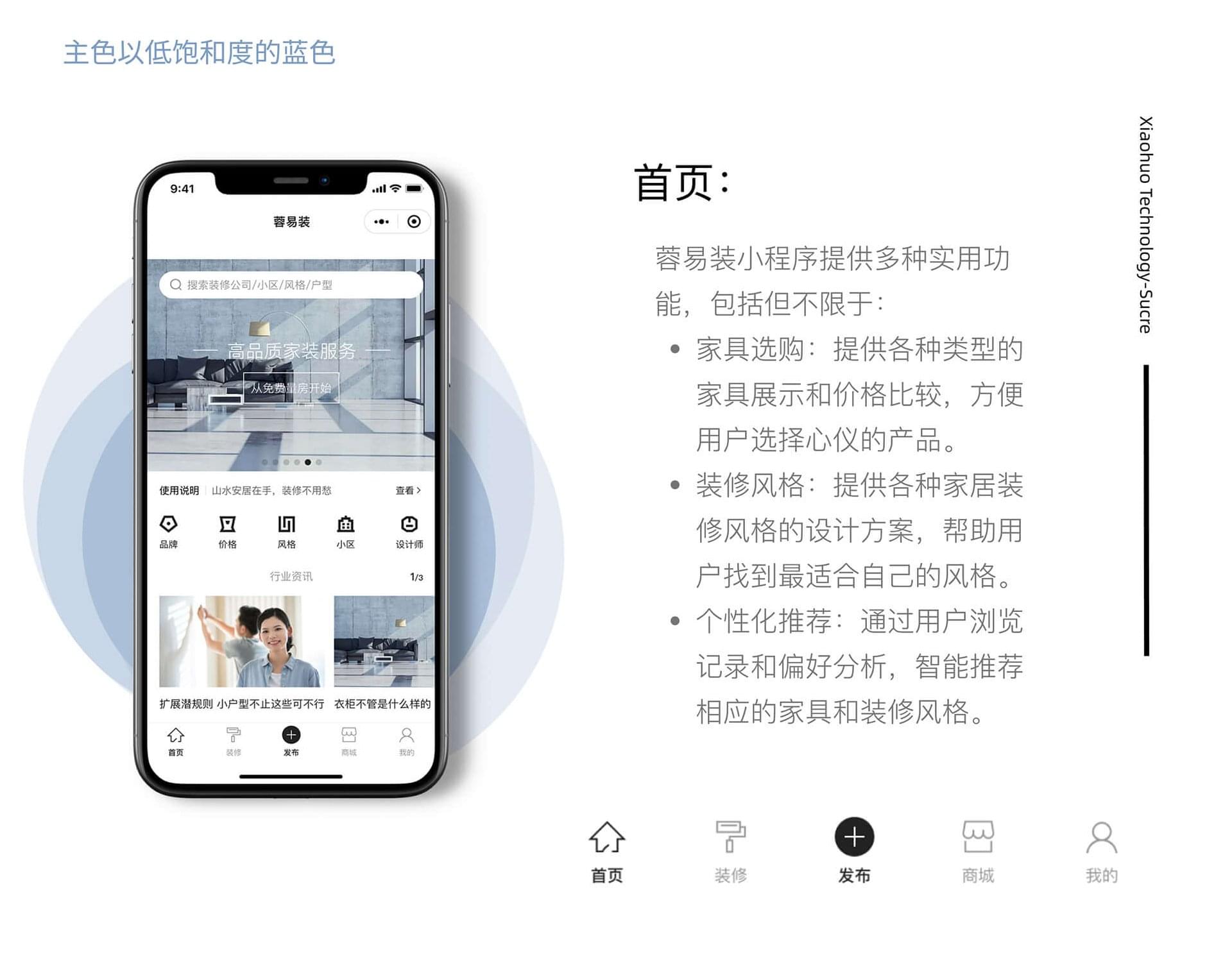 投入不大,落地很快,又能带来实际效果的创新,就需要赶紧落地。我们来看看小火科技开发的这套针对装饰企业的小程序。小程序的界面完全可以自定义,想用什么色系就用什么色系,而且可以对接视频,支持直播,支持在线支付等,可以说一个简单的小程序,把市面上最核心的功能,都集合在一起,用户体验感是很棒的。关键是定制开发的小程序可以按照装饰企业的客户群体特征,以及企业的营销布局,制作很有吸引力的界面和功能。就拿小火科技开发的这套蓉易装小程序,按照用户的需求,设置了:家具选购、装修风格、个性化推荐、设计师、商城、品牌、小区等专栏。
