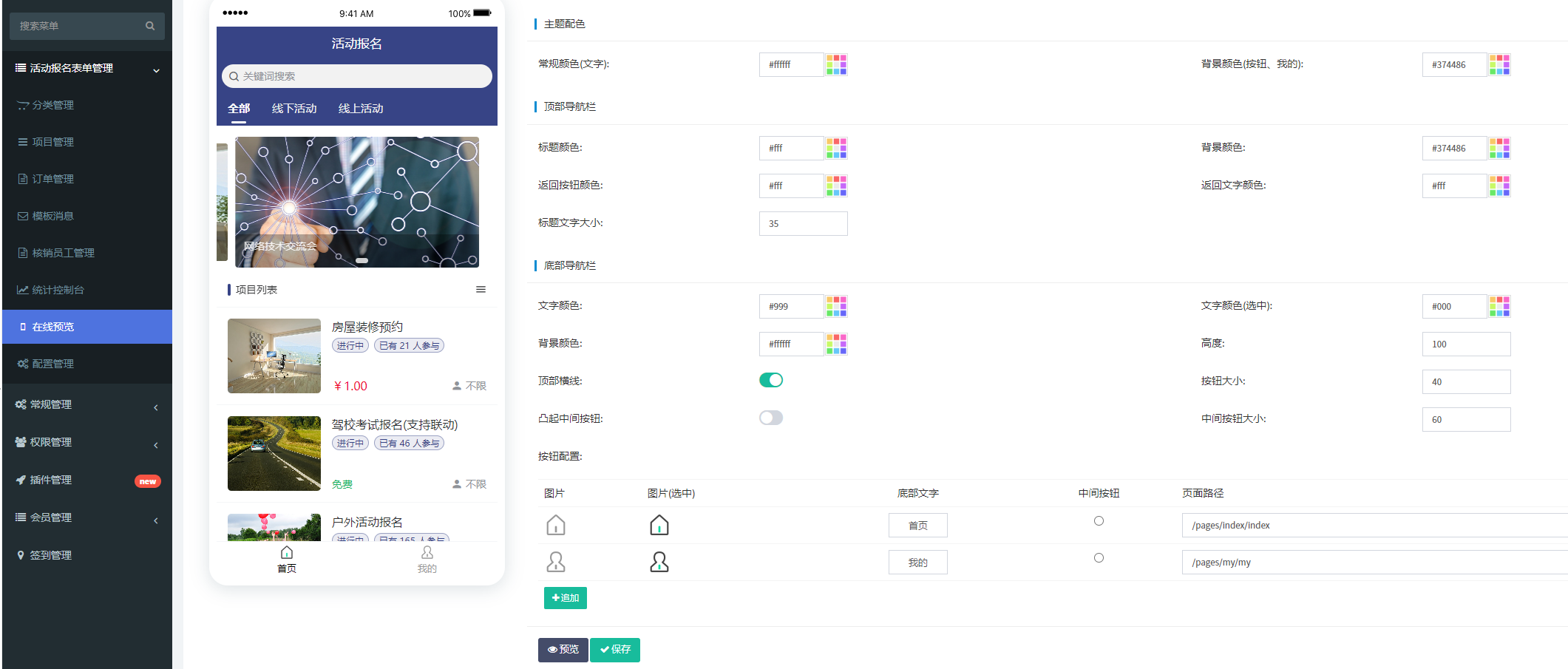 支持后台配置移动端颜色、背景、文字等样式,支持自定义导航栏,支持后台实时预览,让您的小程序更具个性化。